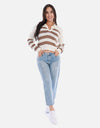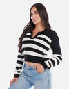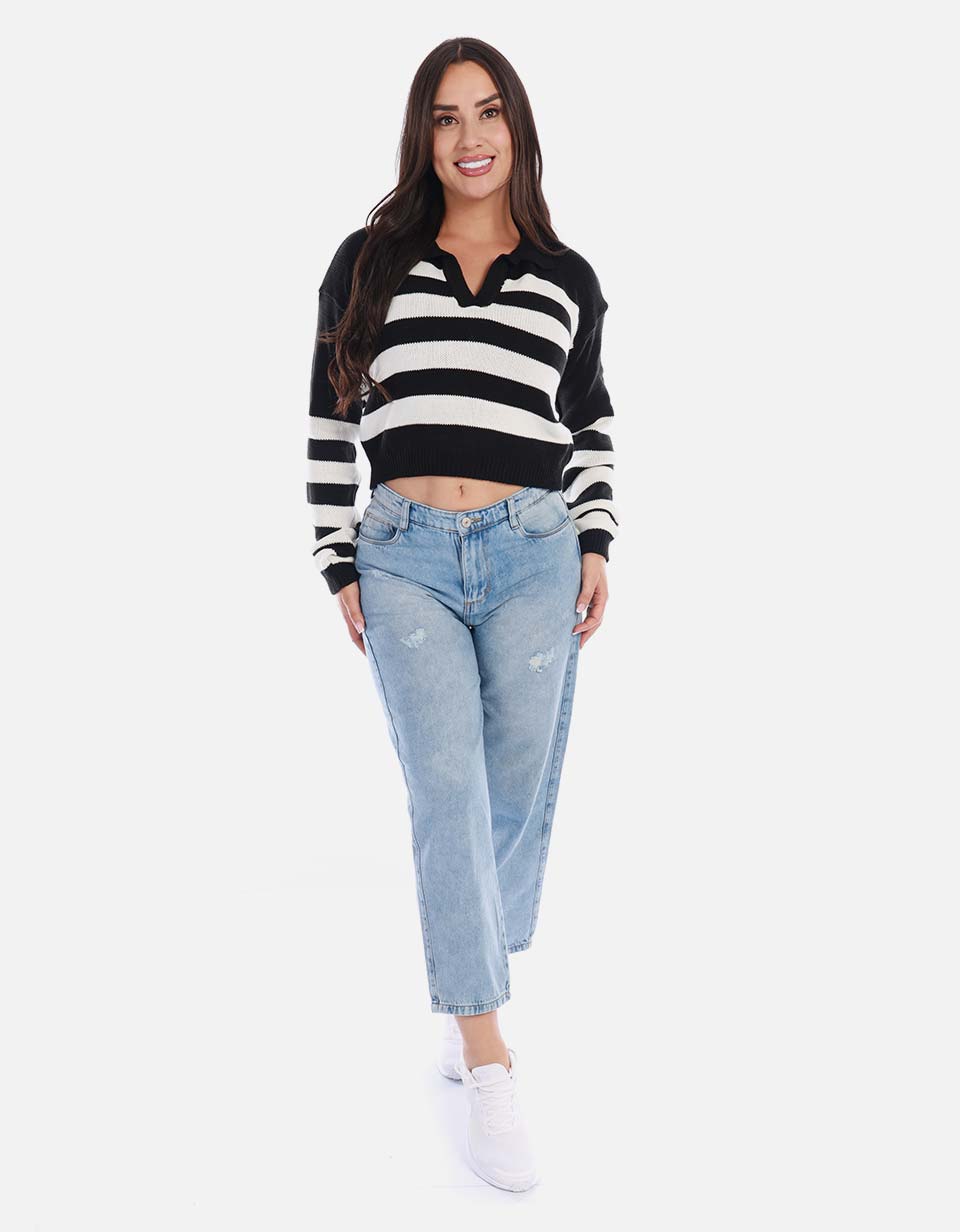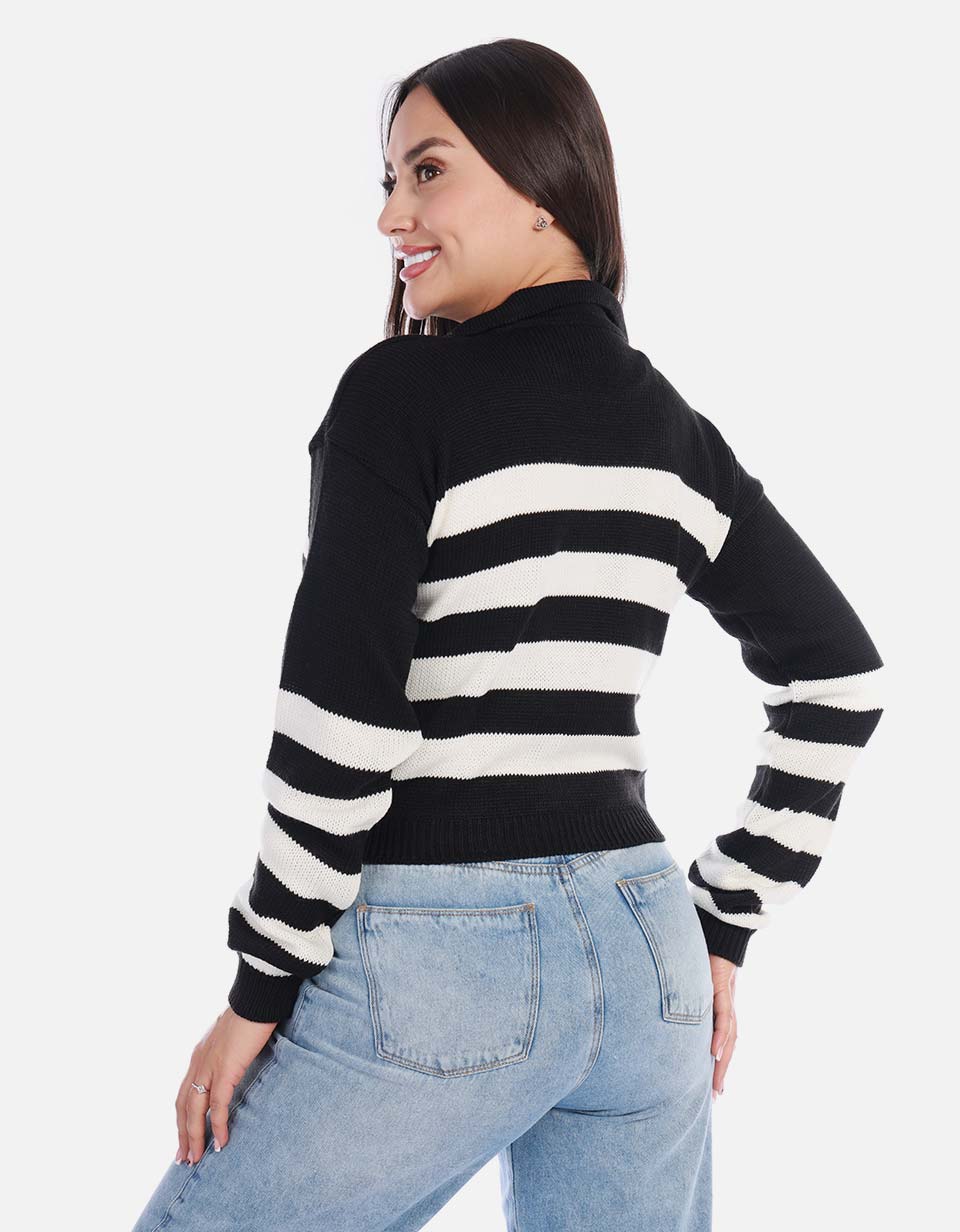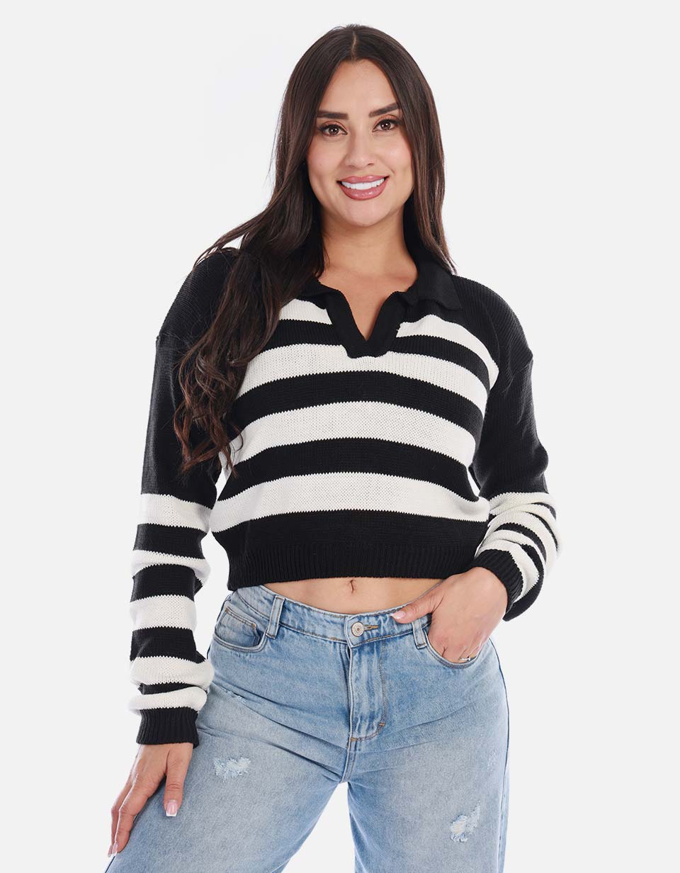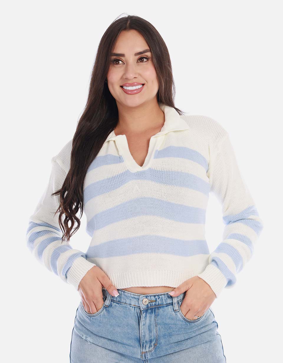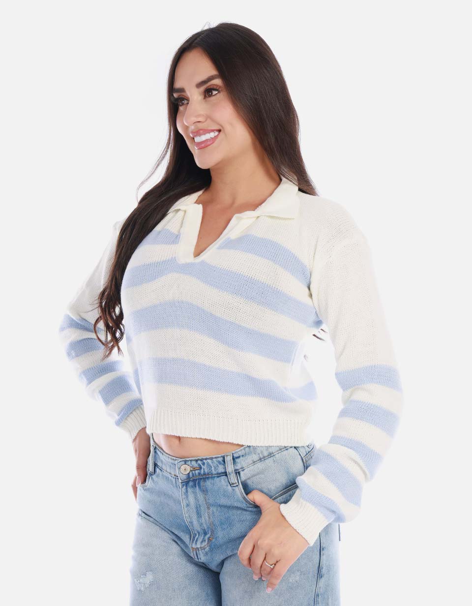 Este buzo con diseño a rayas es la mezcla perfecta de estilo y comodidad. Su tejido suave y corte moderno lo hacen ideal para crear looks casuales y actuales. Una prenda que destaca por su frescura y encanto juvenil.
