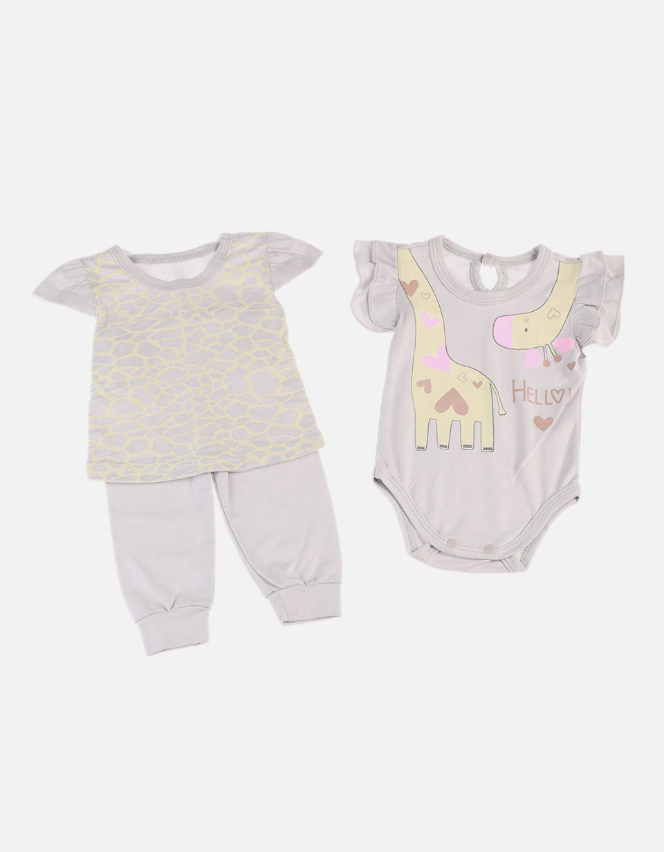 Conjunto para bebé compuesto por body con volantes y estampado gráfico, y set de camiseta y pantalón con diseño coordinado. Ambos estilos presentan temática de jirafa y detalles decorativos, ideales para uso diario o como regalo. Combinan comodidad, color y diversión en cada prenda.