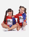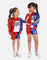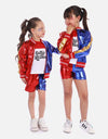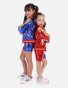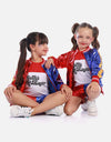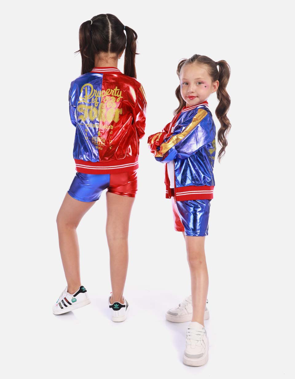 Dale un toque a su disfraz con el conjunto de Harley Quinn. Incluye una chaqueta roja y azul, una camiseta con el logo de Harley Quinn y pantalones cortos a juego. Ideal para Halloween. Este disfraz es perfecto para las pequeñas que aman a los personajes audaces y divertidos.